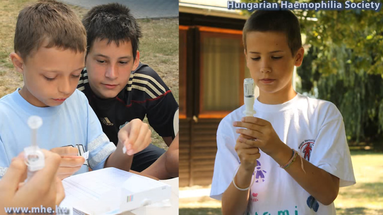 „A Magyar Hemofília Egyesület több mint húsz éve szervez nyári táborokat a hemofíliás gyerekek számára. Ezekben a táborokban, a Balaton mellett, biztonságos körülmények között, orvosi, szakápolói, gyógytornászi felügyelettel tapasztalhatnak meg és sajátíthatnak el a gyerekek egy olyan életmódot, amely nagyon közel áll egészséges társaik életmódjához, sok-sok mozgással, kirándulással, sportolással. Az egyetlen különbség az, hogy itt minden nap a gyógyszerek beadásával kezdődik, de ez pontosan olyan természetes része a napnak, mint a fogmosás. Ez a hét nagyon hatékony lehetőséget biztosít a gyerekek számára, hogy elsajátítsák az öninjekciózást, a csoport ereje a legtartózkodóbb gyerekeket is átsegíti a kezdeti nehézségeken, minden gyerek azzal a sikerélménnyel megy haza, hogy már képes rá, hogy önállóan beadja magának a gyógyszerét.”