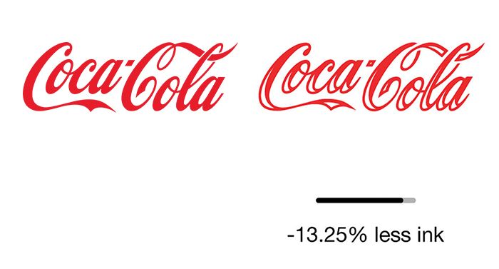 A sok teli logotípia és minta helyett inkább levegős, kecsesebb formákat terveztek, amik továbbra is tök jól mutatnak, mégis sokkal jobbat tesznek a környezetnek. Az alábbi képeken azt is pontosan kiszámították, hány százalékkal kevesebb tinta kell így a logókhoz – érdemes lenne újragondolni őket: