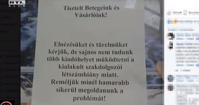Pultra ragasztott üzenetben kérnek elnézést és türelmet a vásárlóktól egy miskolci patikában, mert a munkaerőhiány miatt csak egy gyógyszerkiadó ablak működik, így lassabban tudják kiszolgálni a vevőket, emiatt pedig többet kell várakozni – számolt be az RTL Klub Híradója.