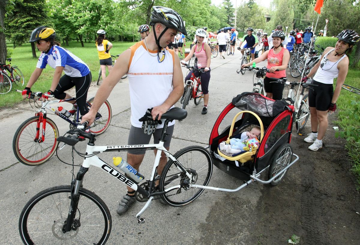 Bringázni nagy dili, gyereküléssel, utánfutóval vagy cargo bringával is szállíthatunk gyereket (Fotó: MTI)