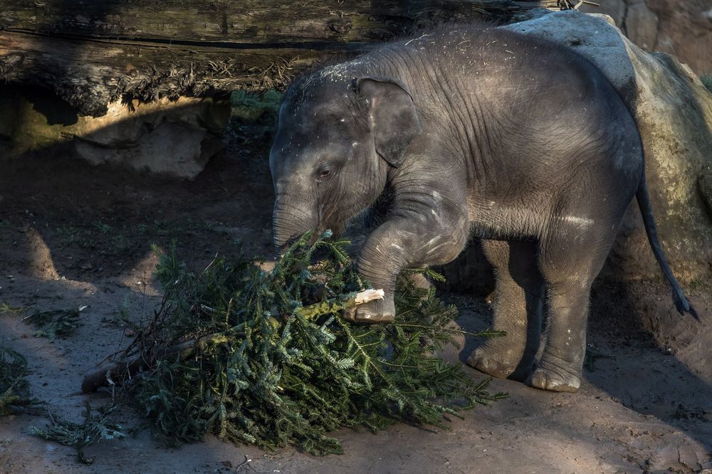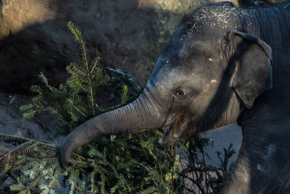 Igazán cuki képek érkeztek a prágai állatkertből, amint egy ázsiai elefántborjú fenyőfát majszol.