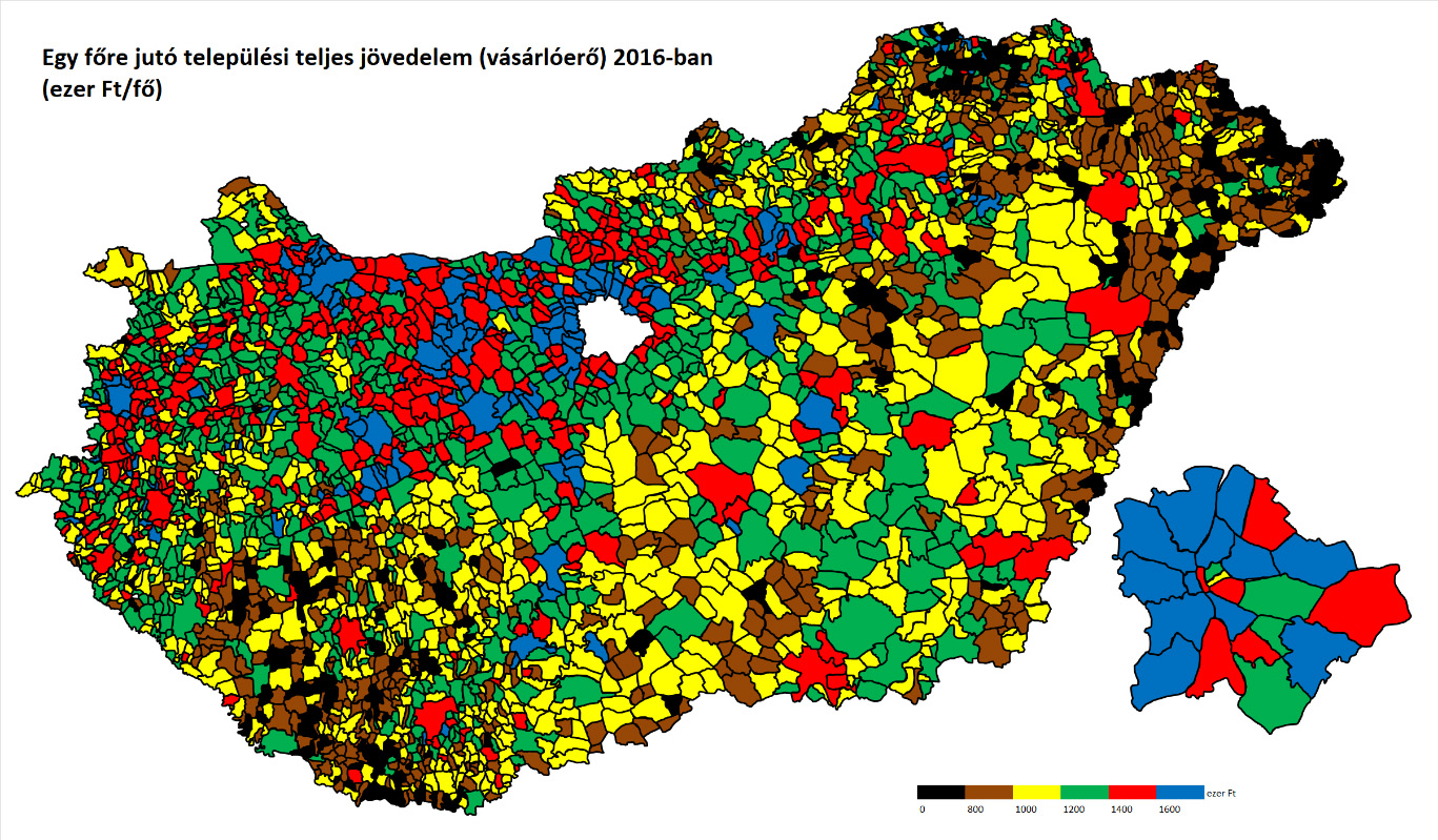 A GKI Gazdaságkutató Zrt. a NAV és a KSH adatait felhasználva megbecsülte a települések vásárlóerejét (teljes jövedelem) a 2009–2016-os évekre. Kiderült, hogy 2016-ban az egy főre jutó vásárlóerő 1,2 millió forint volt átlagosan Magyarország településein. Természetesen nagy volt a szórás, a legszegényebb és a leggazdagabb település között közel 3 millió forint volt a különbség.