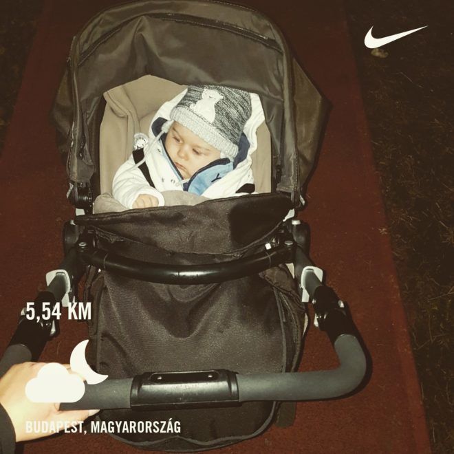 Nem elhanyagolható tény, hogy Patrik alvásidejében történt a nagy közös első futásunk, úgyhogy babának és mamának is egyaránt kikapcsolódás volt a testmozgás. Csak a végén ébredt fel, amikor vége lett ennek az újfajta zötykölődésnek.