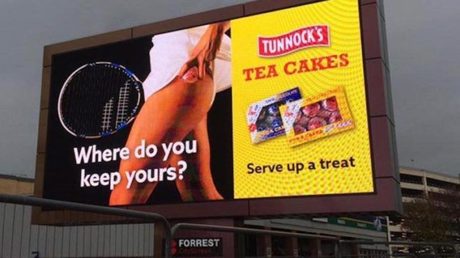 Glasgow-ban nemrég egy teasüteményt reklámozó plakát adott okot a feminista diskurzus élesedésére. A Tunnocks óriásplakátján egy teniszező nő combja látszik, amint egy kis csomag sütit húz elő a szoknyája alól. A tenisz tematikát lovagolja meg a szlogen is, mely így hangzik: szerválj magadnak egy sütit (serve up a treat).