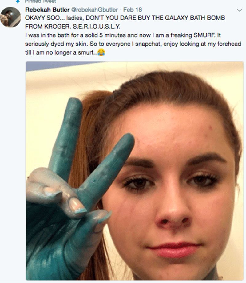 Egy hosszú, fárasztó nap után elmerülni egy nagy kád habos, illatos vízben az egyik legjobb döntés lehet, de úgy tűnik csak akkor, ha a megfelelő fürdőbombát választjuk hozzá. Rebekah Butlernek például nem jött ez össze: ő a Kroger Galaxy Bath Bombjával próbálta felturbózni a fürdővizet, de a végeredmény durva átalakulás lett. A fürdőbomba ugyanis teljesen beszínezte Butler bőrét, olyannyira, hogy a türkizben pompázó fiatal lány leginkább tényleg egy hupikék törpikéhez hasonlít.