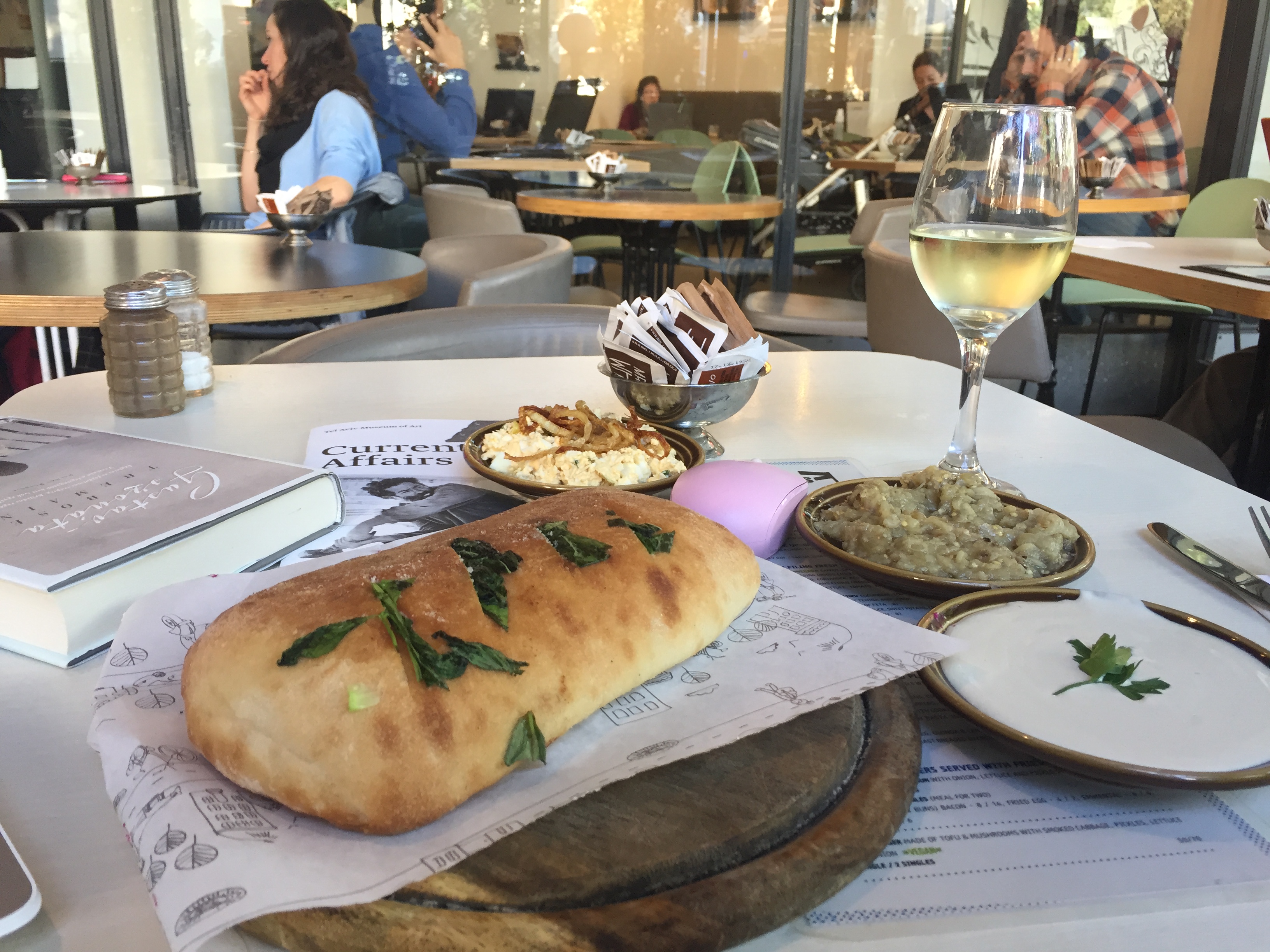 De lépjünk egyet a nagy kedvencre, a The Streets kávézóhálózatra, ahol gluténos marokkói kenyeret kínálnak (ez itt a ház kenyere, lehem abait – ez mindenhol van egyébként, nagyon érdemes kikérni belőle, mert apai-anyait beletesznek) 3 szabadon választható kenős, tunkolós cuccal. Utóbbiakkal én elég fantáziátlan vagyok, ám a pirított hagymaszálakkal hanyagul, de szépen megdobált tojássaláta, a grillezett, friss padlizsánkrém és a világ legbrutálisabb tahinije, vagyis szezámmagkrémje az, amitől valahogy mindig jobban elgyengül a térdem. De persze a smoothie-k is könnyfakasztóak, vagy a szinte rövidként „beverhető” gyömbéres, céklás cucc, ami, gyanítom, legalább 40 fokkal immunerősítőbb egy mezei magyar vodkánál, ha nem is a nagyapám házi pálinkájánál. Ha csak két órám lenne Tel-Avivban, biztosan itt tölteném el, itt ugyanis livestreamben láthatom az igazi Tel-Avivot, teli szájjal, egy finom pohár borral.