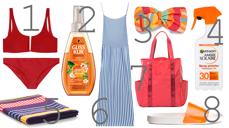 1. Piros bordázott bikini – Tezenis / 2. Gliss Kur Summer Repair kondicionáló spray száraz hajra – Schwarzkopf / 3. Csíkos fejpánt – Zara / 4. SPF30-as fényvédő spray – Ambre Solaire / 5. Csíkos strandtörölköző – United Colors Of Benetton / 6. Csíkos, hátul nyitott strandruha – Tezenis / 7. Meggypiros strandtáska – United Colors Of Benetton / 8. Sárga strandpapucs – H&M