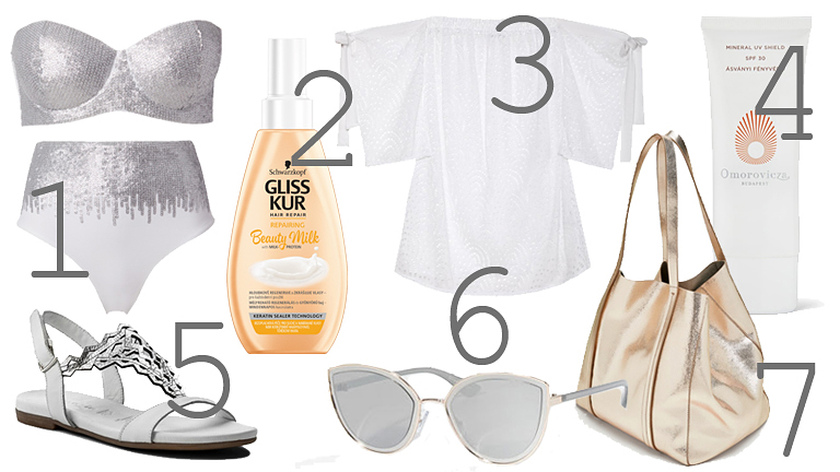 1. Flitteres bikini magasított derékrészű bugyival – Calzedonia / 2. Gliss Kur Beauty Milk hajápoló tej – Schwarzkopf / 3. Áttört jacquard-ruha, ujján csomóval – Tezenis / 4. SPF30-as ásványi fényvédő – Omorovicza / 5. Ezüstösen csillogó szandál – Tamaris / 6. Fémesen csillogó napszemüveg – Parfois / 7. Metálosan csillogó tote táska – Zara