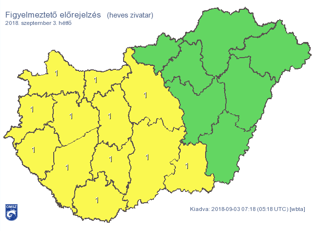 Egyhamar nem fordul jobbra a hétfői esős időjárás. Az Országos Meteorológiai Szolgálat felhőszakadás valószínűsége miatt elsőfokú riasztást adott ki az ország keleti megyéire. Nyugaton, illetve az ország középső részén és Csongrádban a felhőszakadás mellett a heves zivatarok miatt is figyelmeztetést adtak ki.