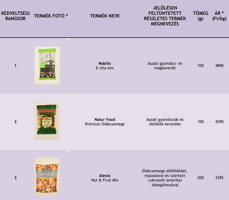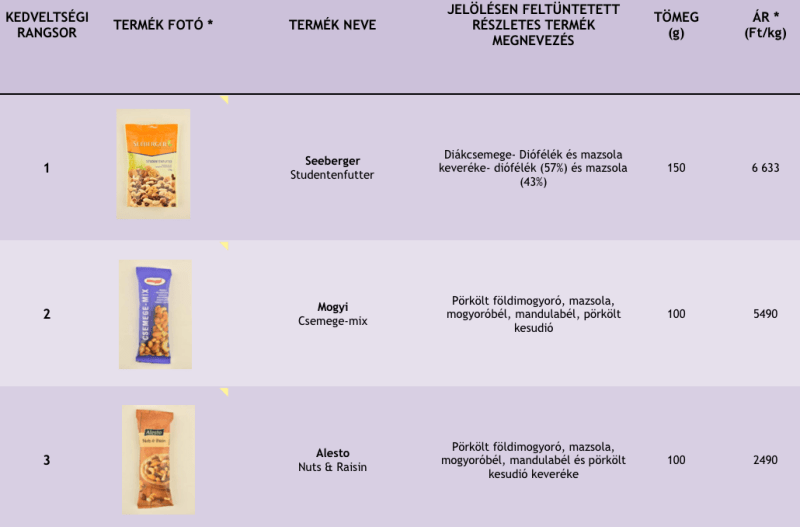 A vizsgálat során meg is kóstolták a diákcsemegéket. A vakteszt során a hagyományos (10 termék) és a speciális (4 termék) diákcsemegéket külön rangsorolták. Ezek voltak a legkedveltebbek: