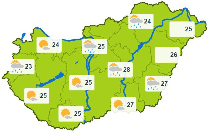 Pénteken a fátyolfelhők mellett nyugaton, illetve északon főként a délutáni óráktól helyenként megvastagszik a felhőzet, és északnyugaton már zápor, néhol zivatar is kialakulhat. A Kisalföldön megélénkül az északnyugati szél, szélerősödés csak zivatar környezetében lehet. A legalacsonyabb éjszakai hőmérséklet többnyire 10 és 18 fok között alakul. A legmagasabb nappali hőmérséklet általában 26 és 31 fok között valószínű, de északnyugaton kissé hűvösebb, 24, 25 fok lesz.