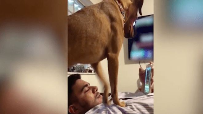 A kutyus úgy érezte, nem kap elég figyelmet a gazdájától, mikor a srác a mobilja képernyőjét görgette. Ezért akcióba lendült: felugrott a mellkasára, és a mancsával egyszerűen kiütötte a kezéből a telefont – így garantáltan megkapta, hogy vele foglalkozzon a gazdi.
