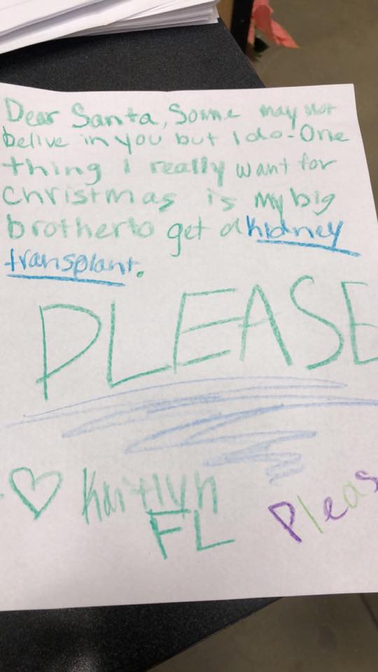 Szívszorító levelet dobott egy kislány a Mikulásnak szánt postaládába egy észak-karolinai áruházban: a Kaitlyn nevű kislány csak egy vesetranszplantációt kért a bátyjának idén karácsonyra. A zsírkrétával írt üzenet a következő: