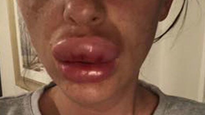 Néhány órával a beavatkozás után az ajkai rettenetesen megduzzadtak és elviselhetetlen nyomást érzett. Videóchaten beszélt az ajakfeltöltést végző nővel, aki azt tanácsolta neki, menjen a sürgősségire, mert allergiás reakciója van.