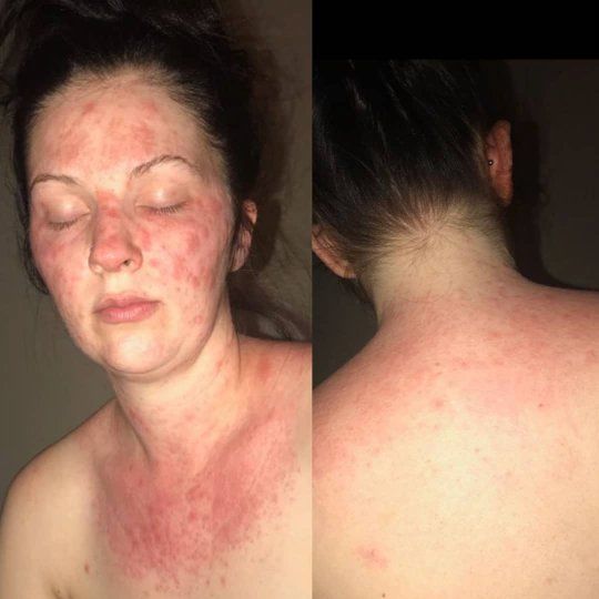 Egy héttel később aztán egy kis sebet vett észre az egyik fülén, de azt hitte csak ekcéma vagy pikkelysömör, és nem is idegeskedett miatta. Egy újabb hét elteltével azonban az arca és a teste más részei is kisebesedtek, a szeme pedig bedagadt.