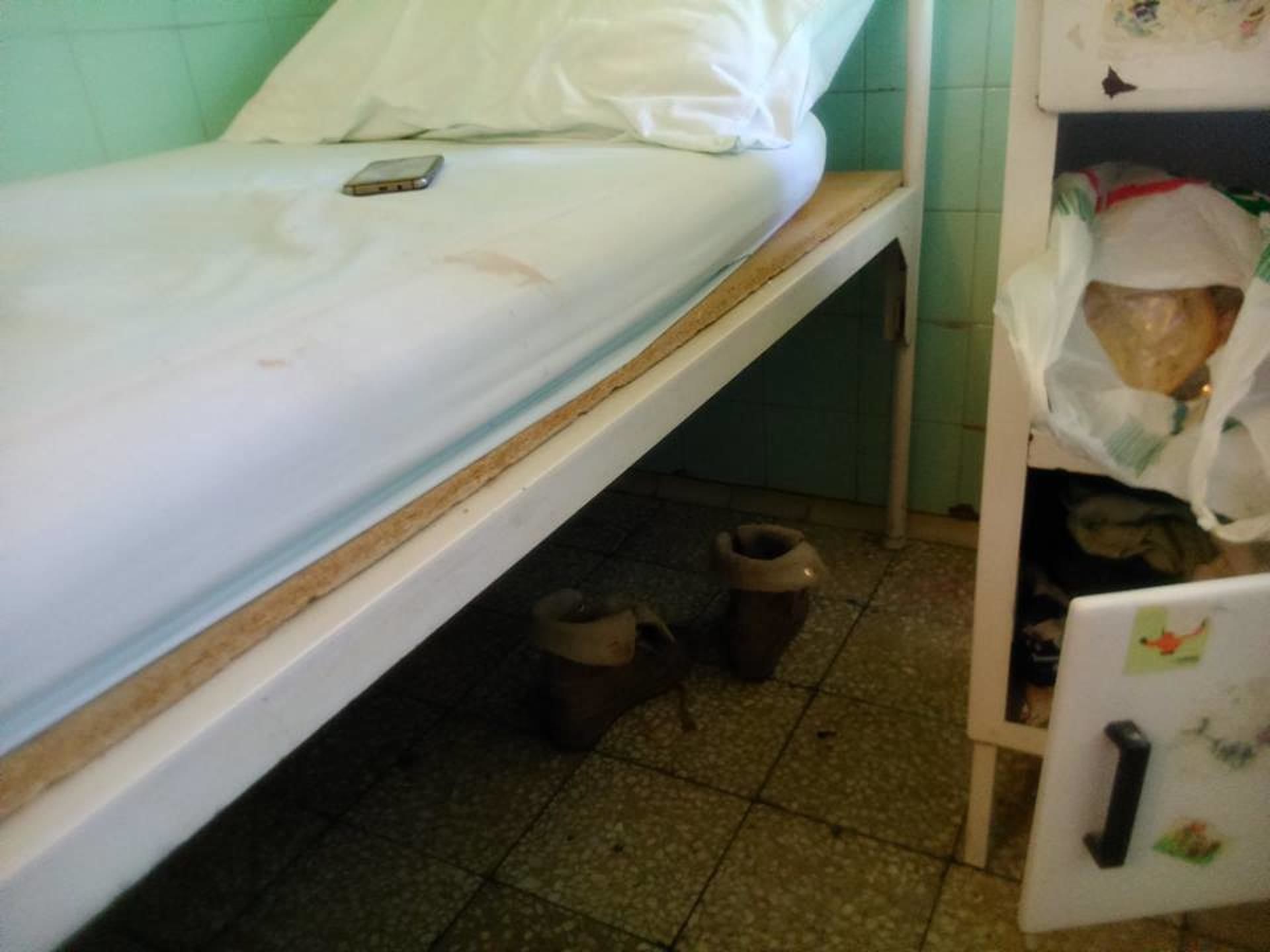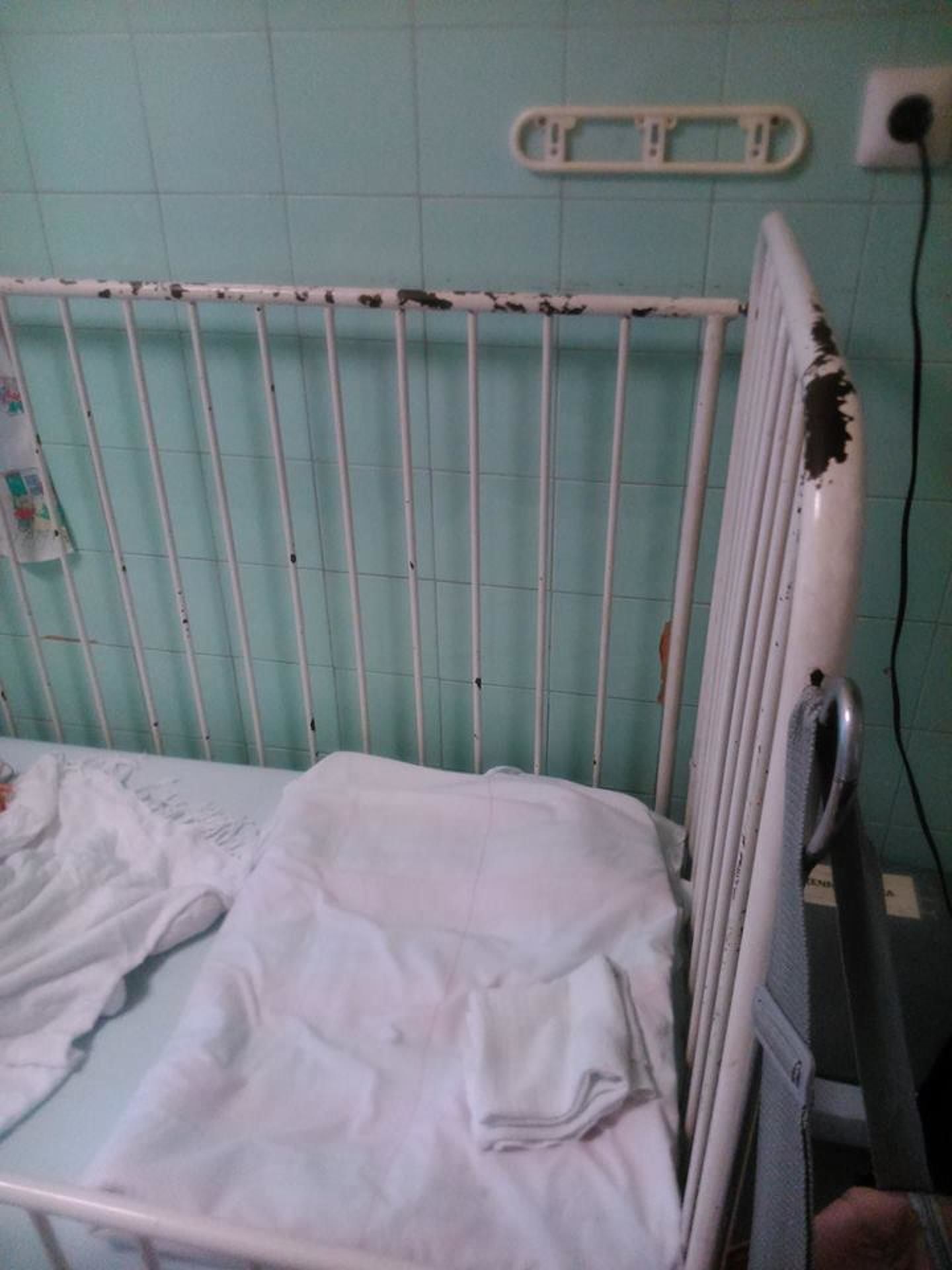 A Nyári utcai intézményben rozsdás rácsos ágyak és éjjeliszekrények várják a kis betegeket, a szülőknek fenntartott ágy szivacsát csak egy pozdorjalap tartja, kopott, málló falak mindenütt.