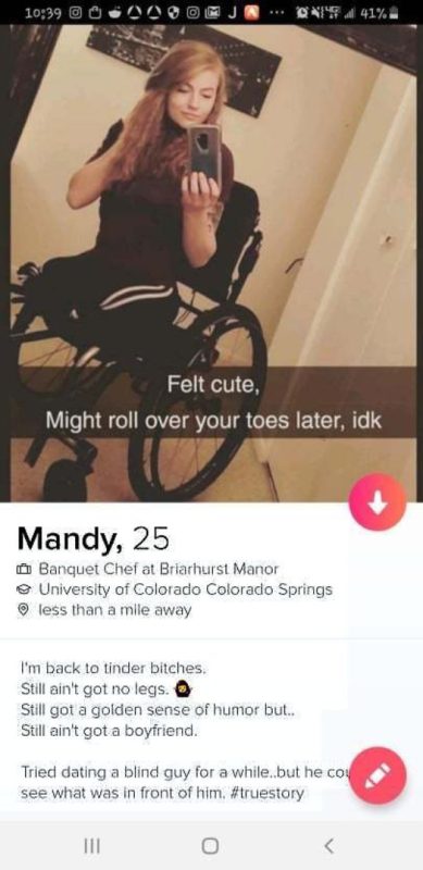 Mandy azonban összeszedte magát, és visszatért a Tinderre is: „Még mindig nincs lábam, még mindig zseniális a humorom, és még mindig nincs pasim” – írja a profilján, a fotón pedig a tolószékében látható, a híres mémre utalva következő szöveggel: „Csininek találtam magam, nemtom, később talán rágurulok a lábujjaidra.” Majd hozzáteszi: „Próbáltam egy vak sráccal randizni, de nem látta a fától az erdőt.”