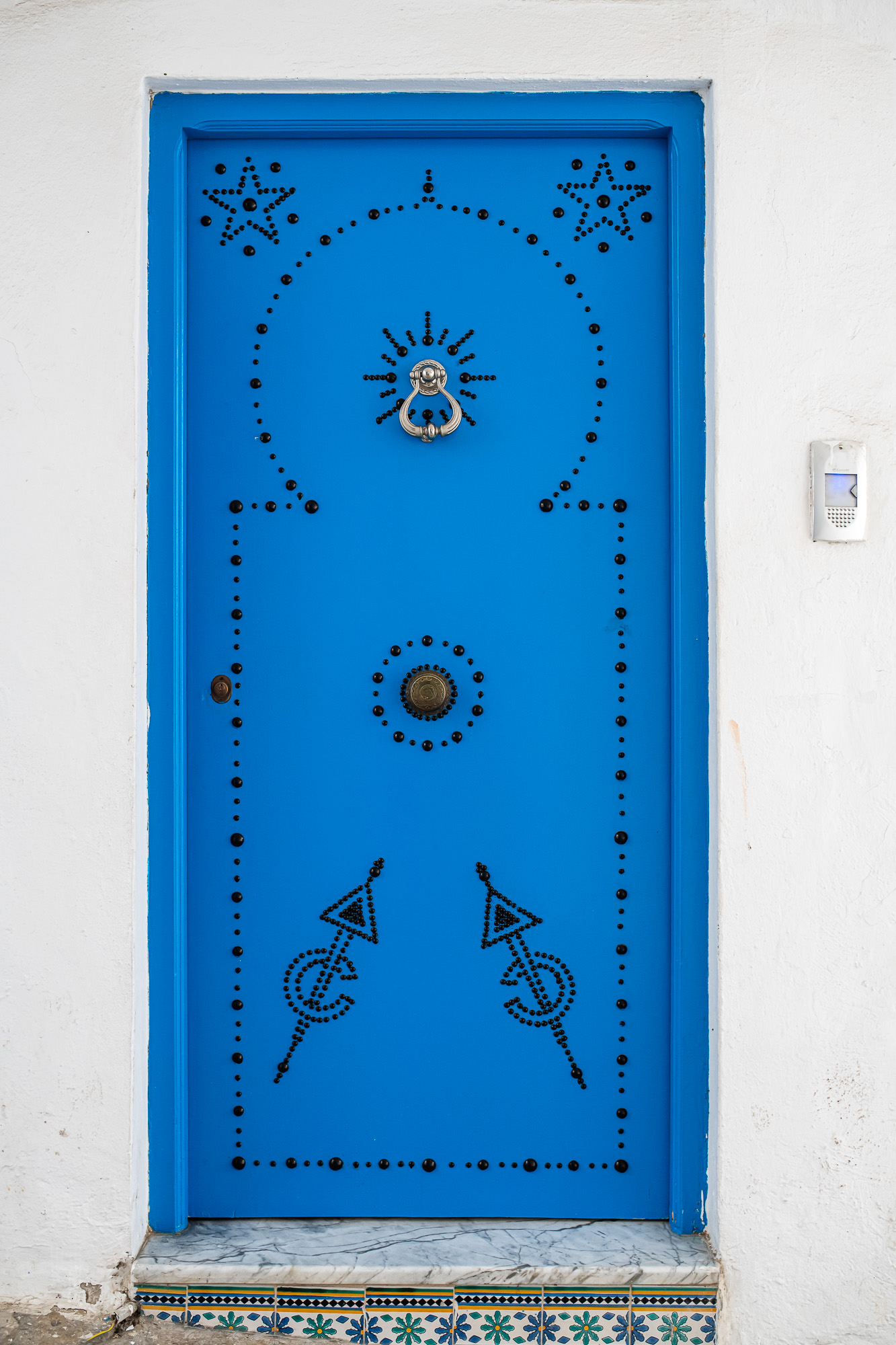 Sidi Bou Said ajtajai nemcsak műalkotások tehát, hanem, ha úgy tetszik, marketingfelületek: így mesélik el a családok, kik ők, és milyen szép az otthonuk. A mintákról nagy műgonddal egymás mellé ütött, változó méretű szögekkel gondoskodnak, amelyeket sokan az ajtóval együtt festenek kékre.