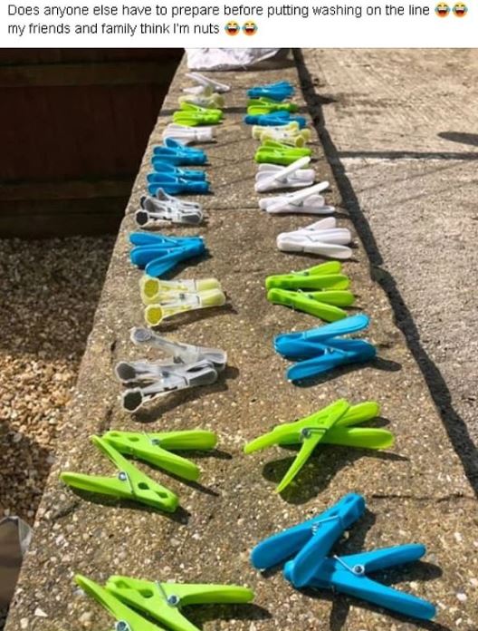 Népszerű beszélgetős posztot indított el egy nő, amikor a We Love Mrs Hinch Facebook csoportban megosztott egy képet a teregetési szokásáról. „Van más is, aki mindig így készül a teregetésre? A családom és a barátaim furcsának néznek!” – írta a kép mellé, amin látszanak a színek szerint párba rendezett ruhacsipeszek.