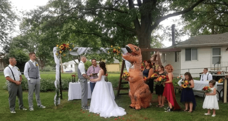 Christina ugyanis nem tett mást, mint szaván fogta barátnőjét, aki azt mondta, bármit felvehet az esküvőjére. Christina pedig Tyrannosaurusnak szeretett volna öltözni.
