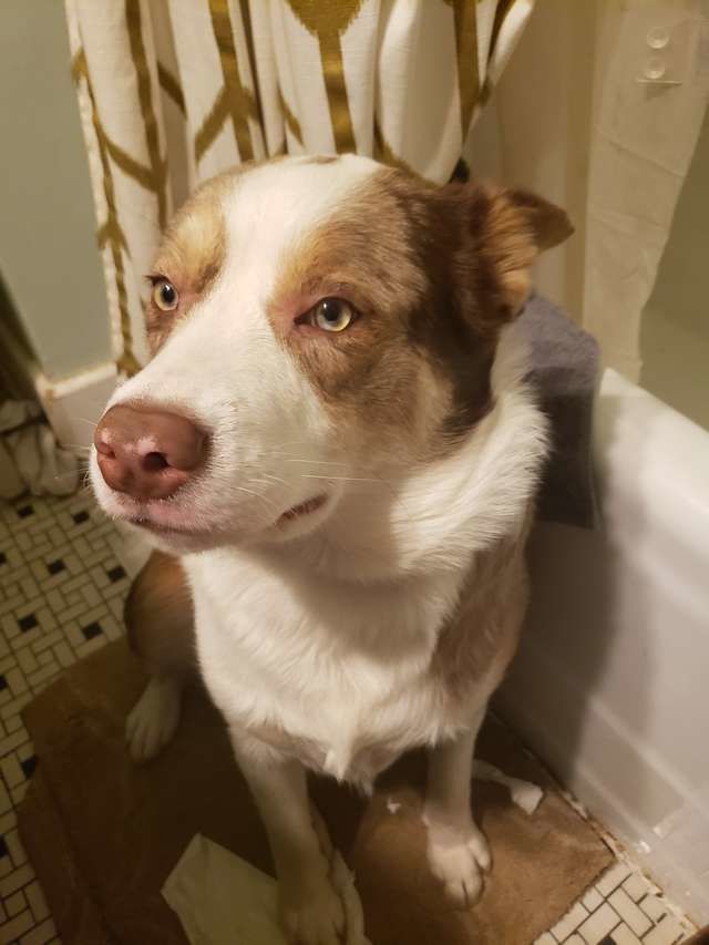 Biscuit a fürdőszobában (Fotó: Elisabeth Dunn Price via The Dodo)