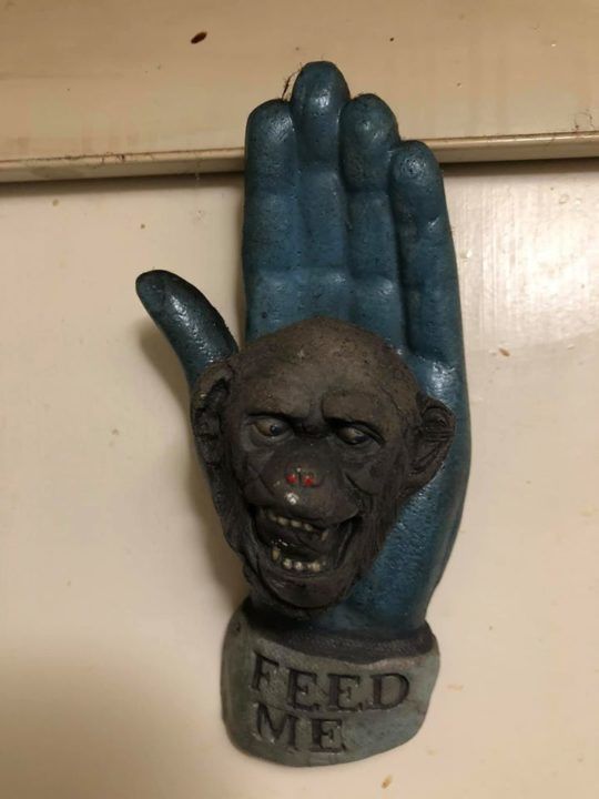 A következő darab egy meghökkentő képzőművészeti alkotás, amelyet a büszke tulajdonos egy bizományi boltban talált és egy másodpercig sem gondolkodott rajta, hogy hazavigye-e. Azóta a tűzhely mellett a falon lóg, ami az írott üzenetet („etess meg”) figyelembe véve hibátlan elhelyezésnek tekinthető. Sajnos azt nem tudjuk, hogy az alkotó mire gondolt, miközben készítette, de feltehetően a készülő ebédre vagy vacsorára.