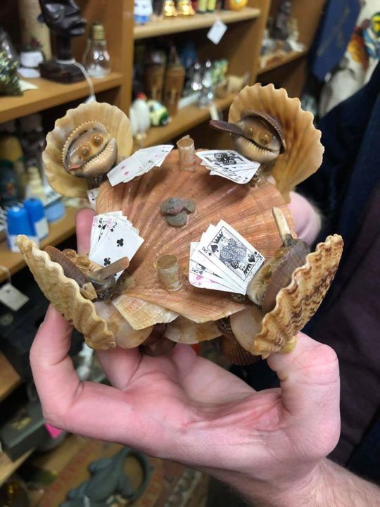 Most, hogy kezdjük elérni az üzemi hőfokot, ideje feljebb tekerni a szürrealitás fokozatát. Az alábbi, csupa nagybetűs CS.O.D.A. egy indianapolisi régiségkereskedőnél lapult. Minél tovább nézzük a képet, annál több apró részletet fedezhetünk fel rajta. Egyfajta többrétegű, már-már filozófiai magasságokban járó alkotásról van szó, hiszen elég, ha végiggondoljuk: kagylószékekben ülő, kagylósapkás kagylók egy kagylóasztal körülülve pókereznek, pénzben. Ja, és még szivaroznak is, hiszen mi mást tenne egy dörzsölt hamiskártyás kagyló, nem igaz? Ahogy a csoport egyik, sokat látott tagja megjegyezte: „én már sok bizarr dolgot láttam, de azt hiszem, ez a legbizarrabb”.