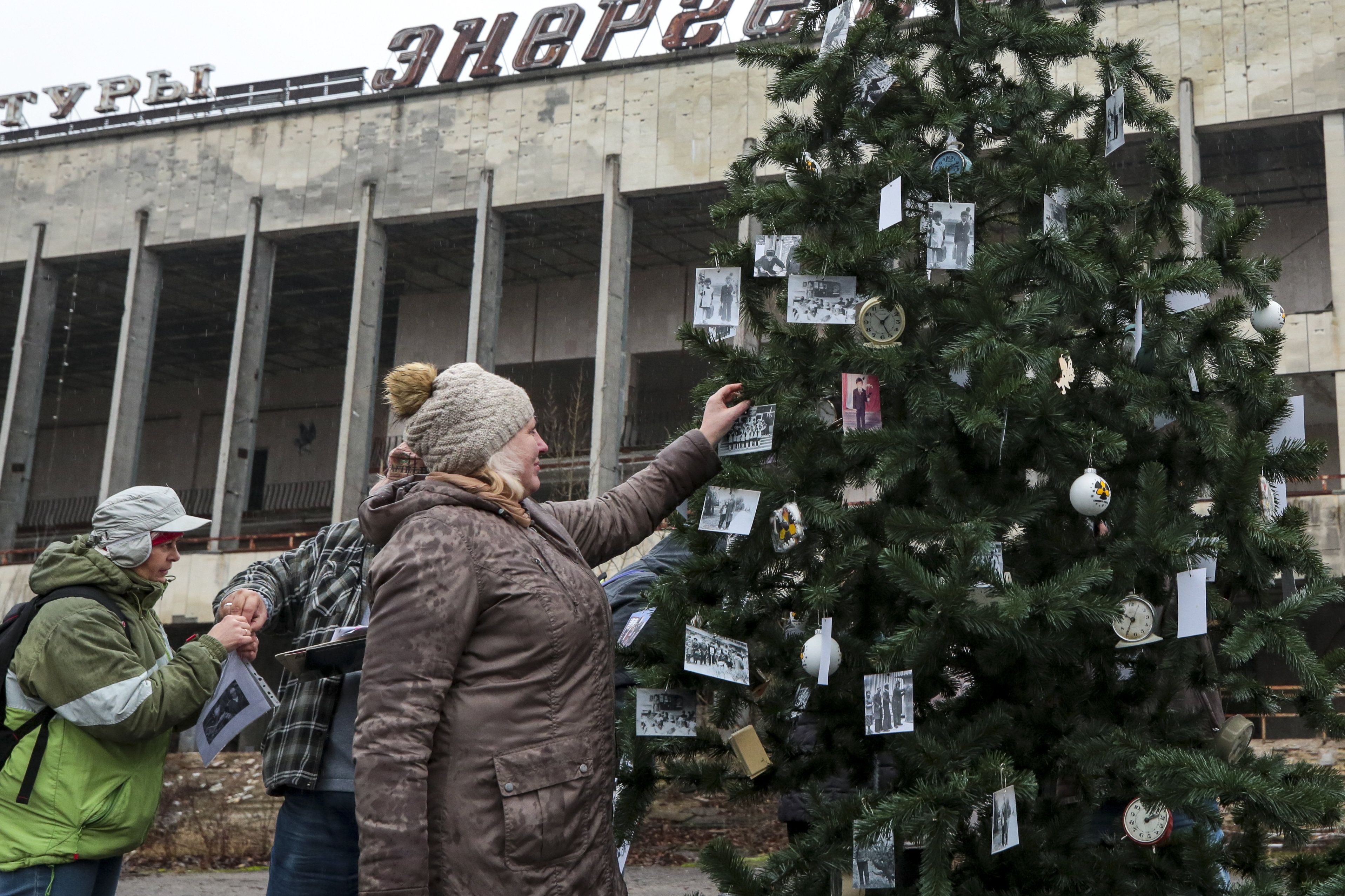 Pripjaty egykori lakói családi fényképekkel díszíttek fel egy fenyőfát a város főterén december 25-én.