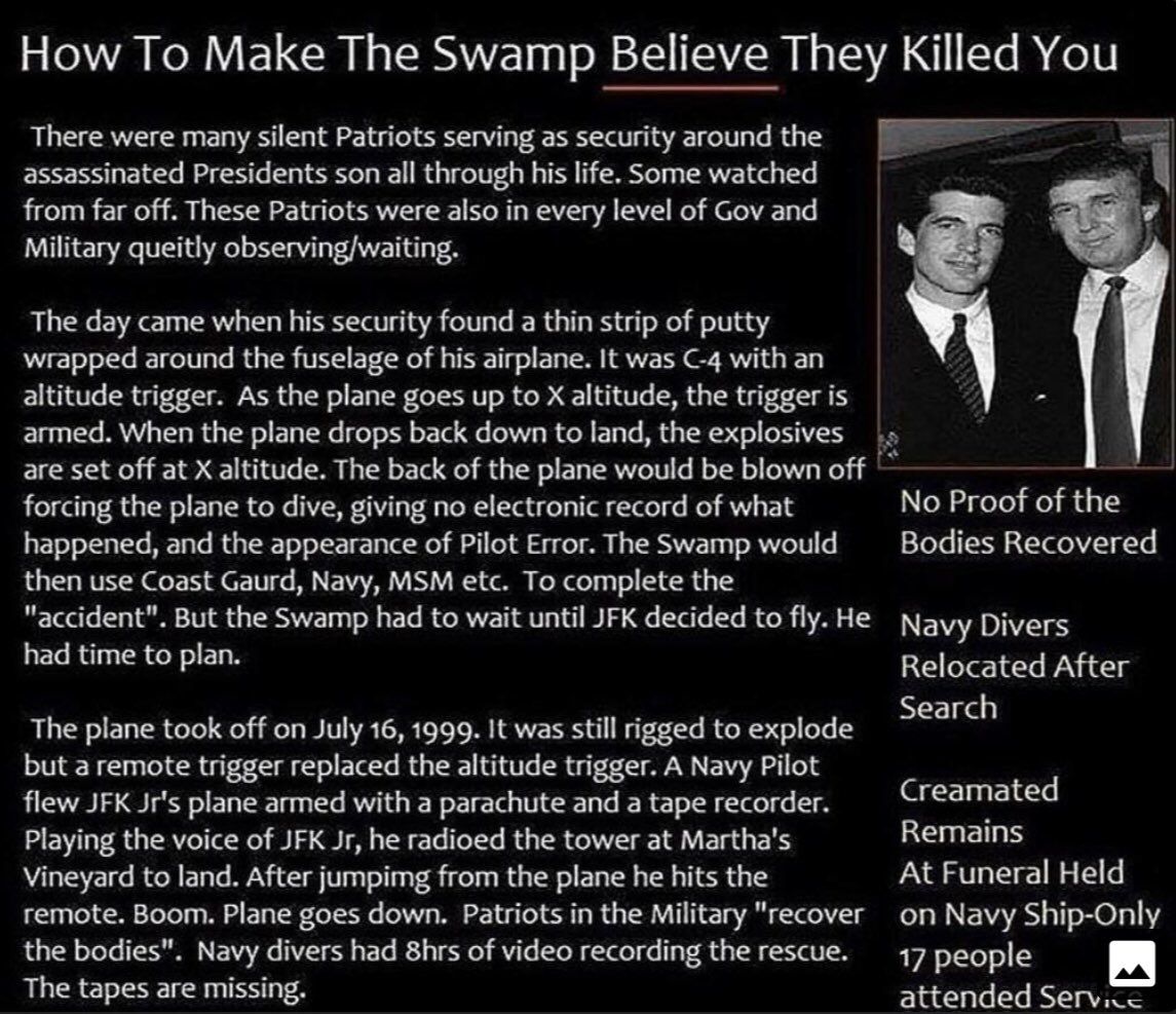 Tehát először 2018 környékén indult meg a szóbeszéd a QAnon valamelyik fórumában, miszerint JFK Jr. valójában csak megrendezte a saját, illetve felesége, Carolyn Bessette halálát, hogy így rejtőzzön el a deep state fürkésző tekintete elől, a rákövetkező években-évtizedekben pedig inkognitóban, Trumpot a háttérből támogatva készült a nagy leszámolásra; még az is komolyan felmerült, hogy az ifjabbik Kennedy a trumpista internet Richelieu-je és Szürke Eminenciása, azaz maga QAnon személyesen.