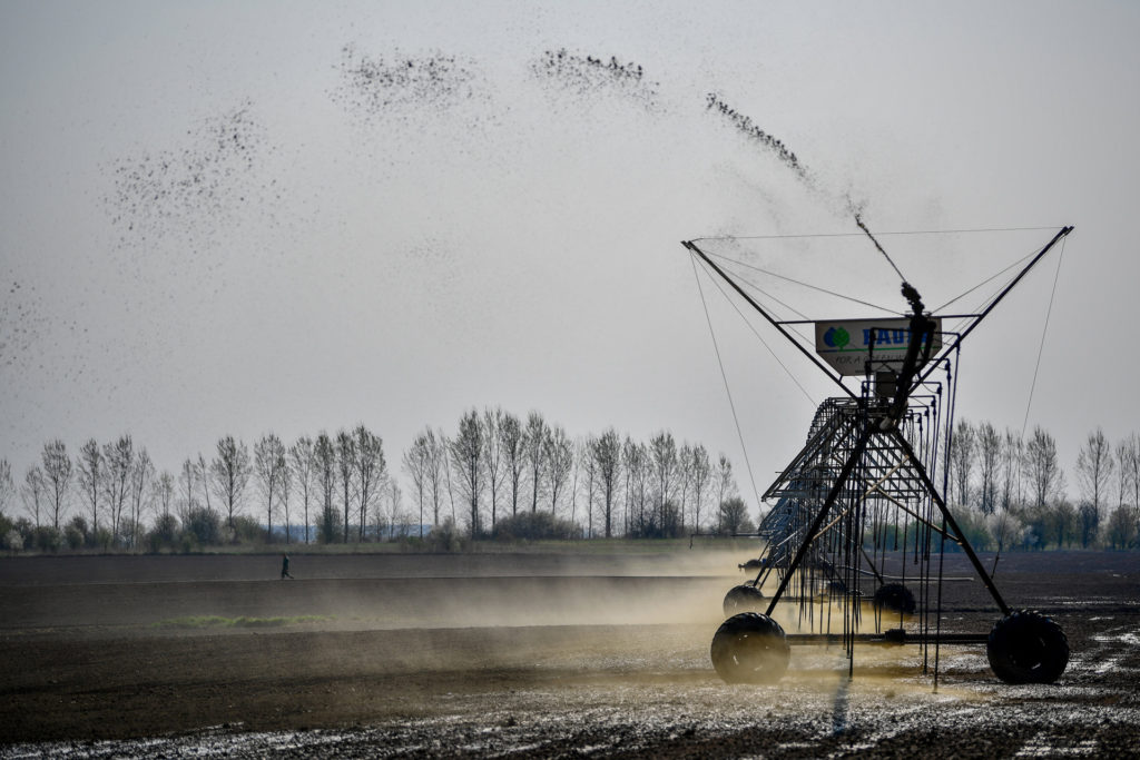 Öntözőrendszer locsol egy szántóföldön a szárazságban, Hajdúszovát közelében, Hajdú-Bihar megyében (Fotó: