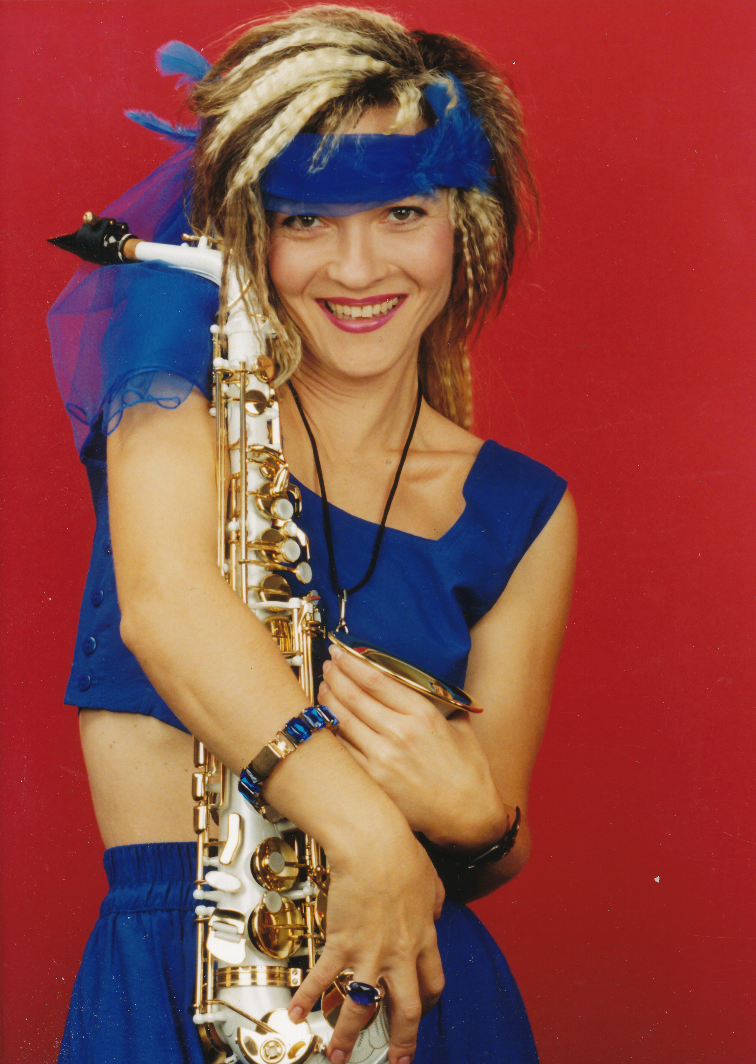 Marcellina és a híres védjegyei, a kreppelt haj és a szaxofon az ezredfordulón (fotó: Credit line:Smagpictures.com / Miklós x Katona)