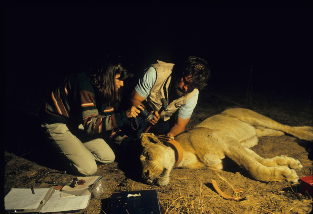 Delia és Mark Owens rádiós helymeghatározót rak egy bebódított állatra, Zambiában (Fotó: William Campbell/Corbis via Getty Images)