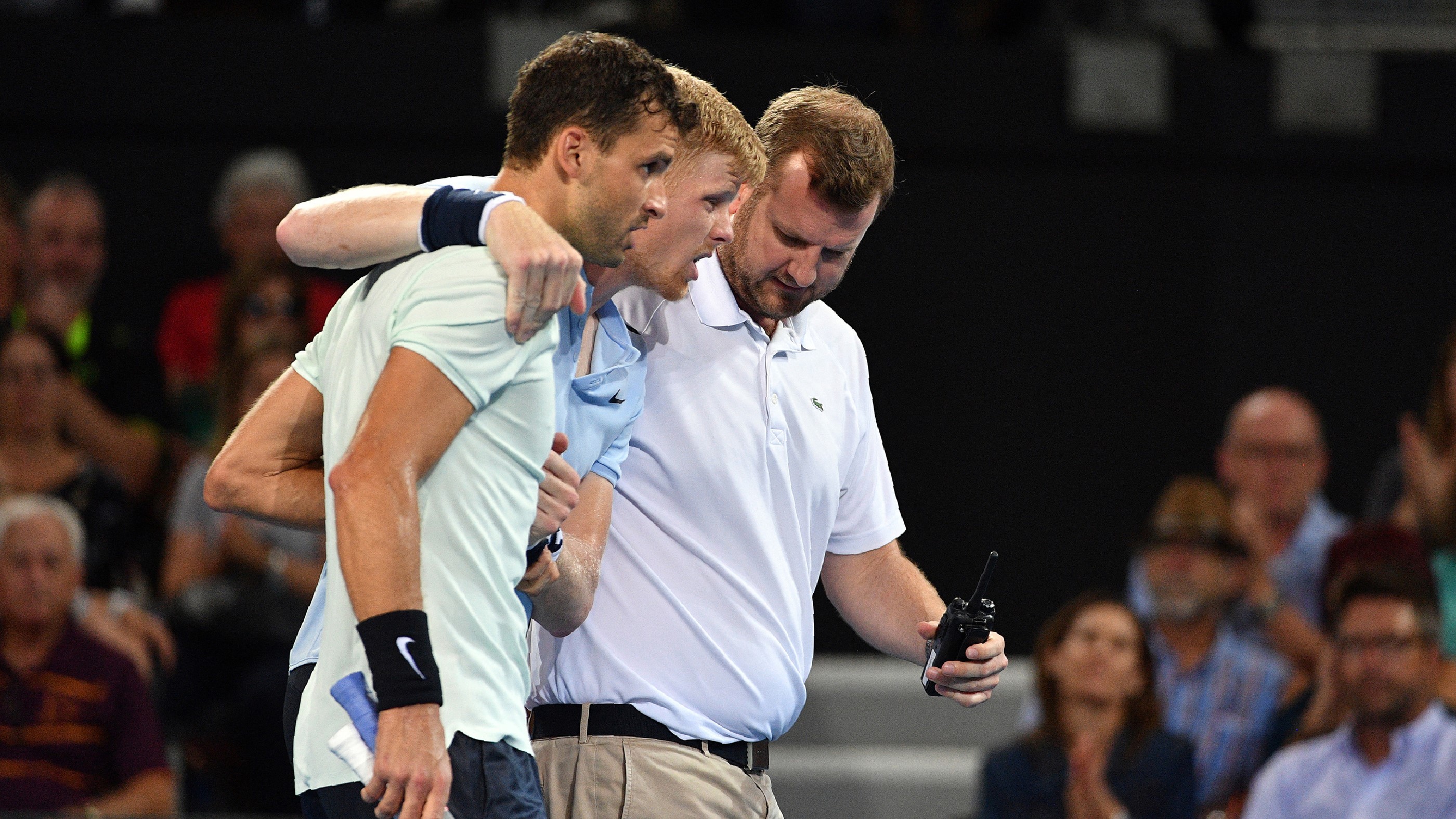 Grigor Dimitrov segít Kyle Edmundnak lemenni a pályáról, miután megsérült a lába a mérkőzésükön (Fotó: Saeed KHAN / AFP)