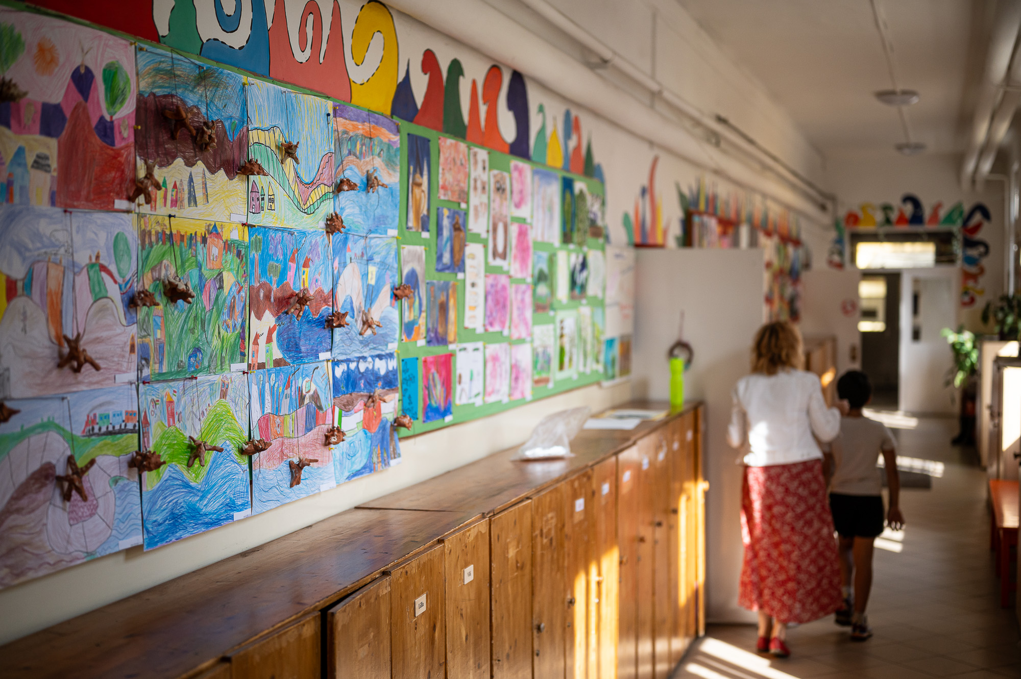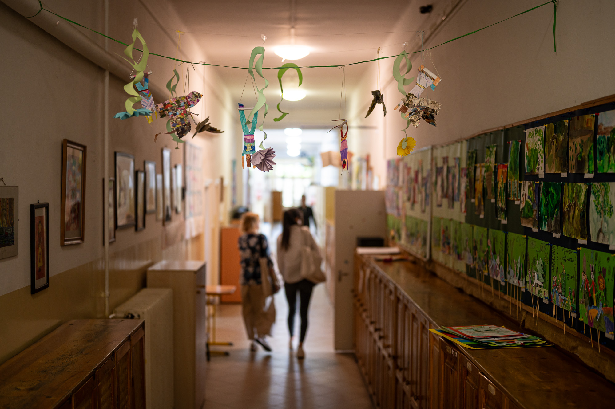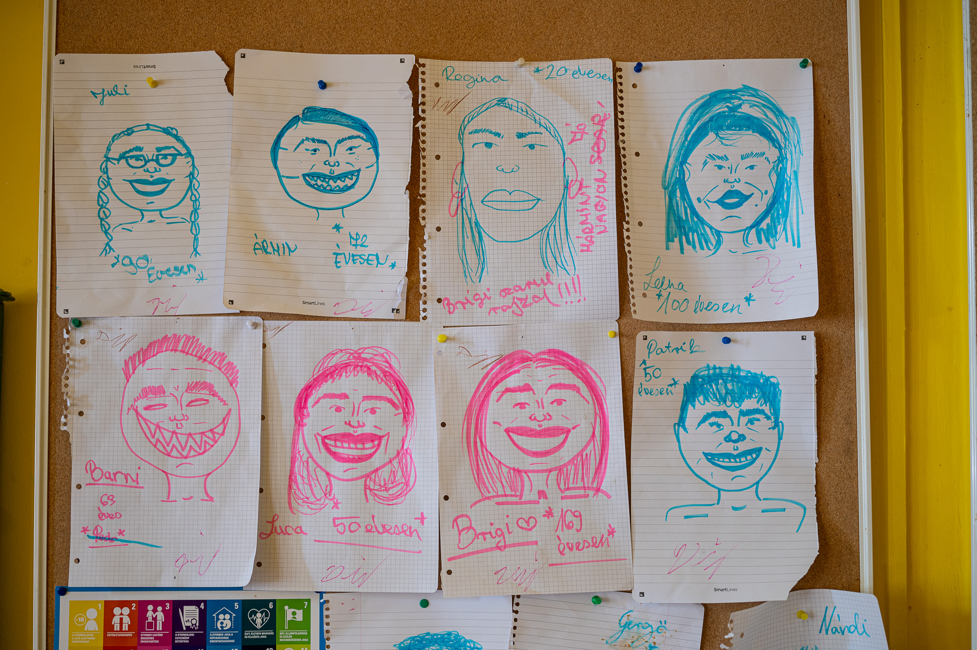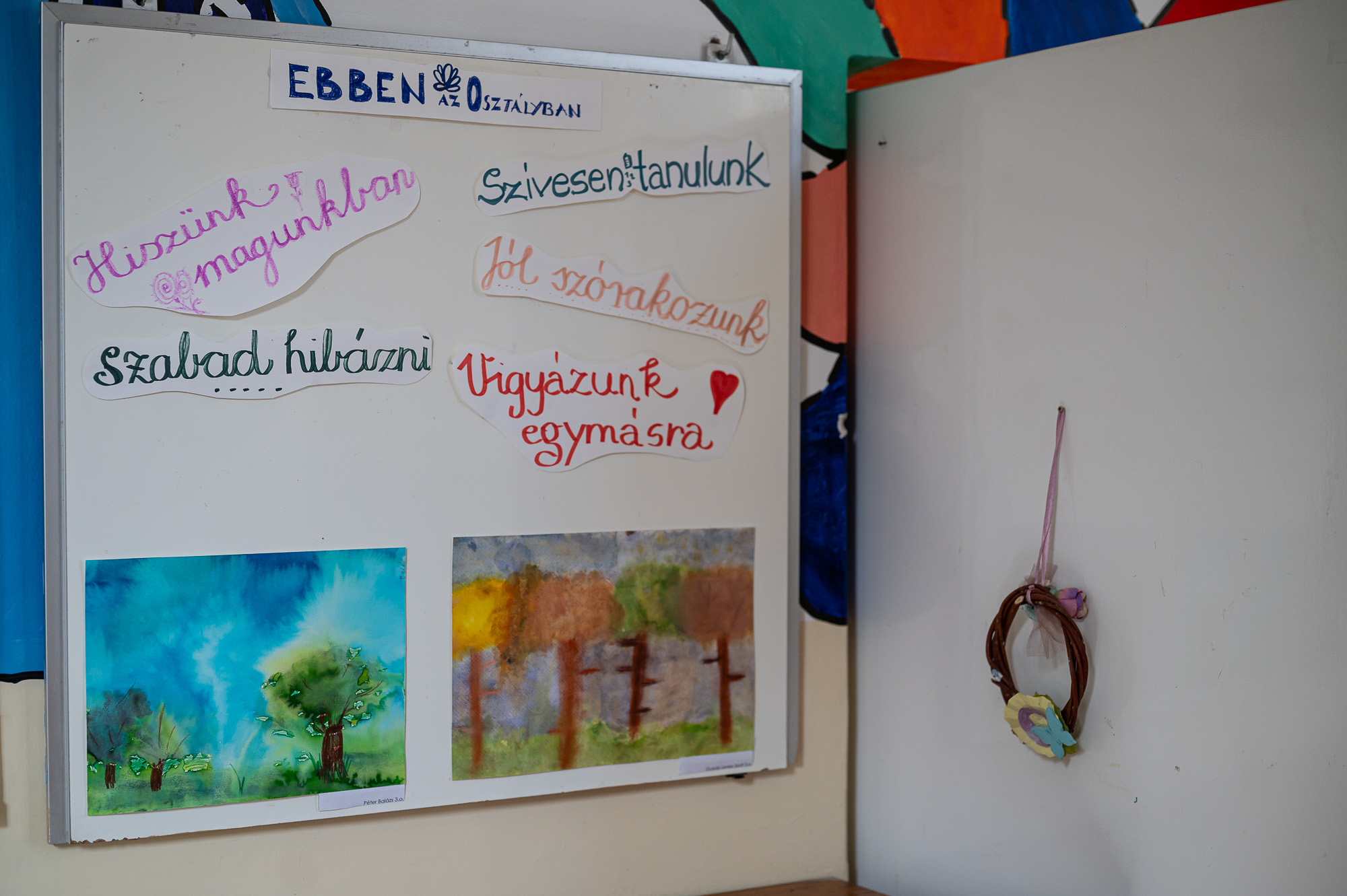 Még csak pár perce vagyunk az iskolában, nekem mégis egyből feltűnik a családias környezet. És ez nem véletlen. A falakon a tanulók festményeit, műalkotásait, az előtérben lévő asztalon pedig a további általuk készített díszeket csodálhatják meg a látogatók. Persze, a nap végén itt is minden ugyanúgy zajlik, mint egy átlagos iskolában, azzal a kivétellel: itt nem gondterhelt arcokat látni, akik alig várják, hogy vége legyen a napnak, hanem izgatott, mosolygó élettel teli arcokat.