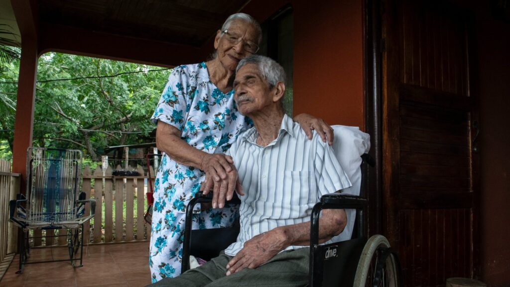 A 91 éves Clementina Espinoza és férje, a 100 éves Agustin Espinoza ölelkeznek a Costa Rica-i Nicoyában 2021. augusztus 27-én (Fotó: Ezequiel BECERRA / AFP)
