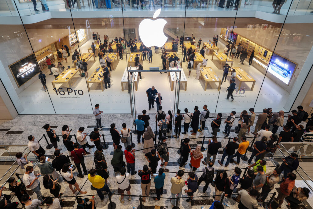 Vásárlók várakoznak az Apple boltja előtt, Kuala Lumpurban, az iPhone 16 megjelenése napján, 2024. szeptember 20-án (Fotó: Annice Lyn/Getty Images)