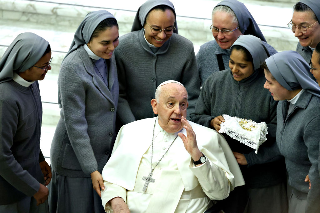 Ferenc pápa apácák társaságában a Vatikánban (fotó: Franco Origlia/Getty Images)