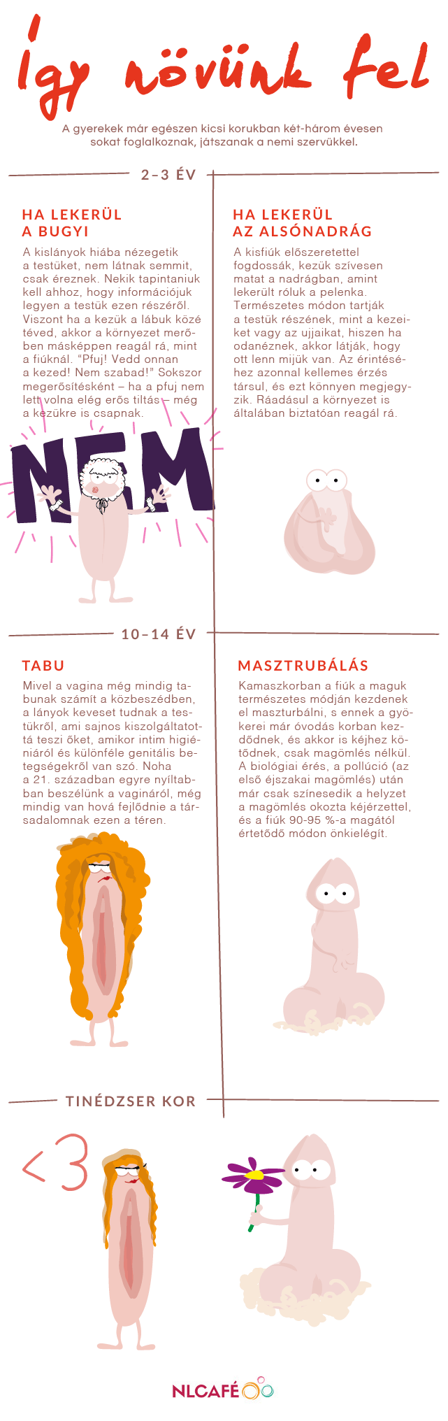 A gyerekek már egészen kicsi koruktól játszanak a nemi szervükkel, a szüleik ehhez való hozzáállása sok mindent meghatározhat. Kedves infografika arról, hogyan nő fel egy punci és egy kuki.