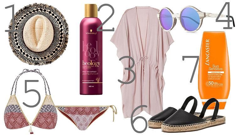 1. Díszített karimájú szalmakalap – Zara Home / 2. Beology Deep Sea Extract Repairing regeneráló sampon mélytengeri kivonattal és algával – Schwarzkopf / 3. Viszkóz strandponcsó – H&M / 4. Cornelius White Birch fakeretes napszemüveg – Kerbholz / 5. Etnomintás bikini – Women’s Secret / 6. Espadrilles szandál – Zara / 7. SPF 50-es, testre való fényvédő – Lancaster
