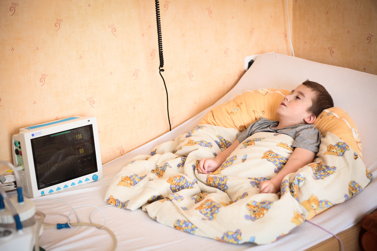 Dávid kilencéves. Kilenc éve fekszik az ágyában, csaknem mozdulatlanul, félig betakarva. Feje kicsit megemelve, lábai aprók, befelé fordulók. Betegellenőrző monitor, párásító, váladékszívó, oxigénpalack: ennyi gép veszi körül őt. Enni nem tud, egy hidraulikus pumpa adagolja a speciális tápszert a hasába ültetett csövön keresztül. Nem lát. Talán hangokat, esetleg érintéseket érzékelhet a külvilágból, de erről biztos tudásunk nincs, mert agya nem működik. Ő a szülei középső gyermeke.
