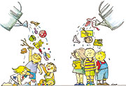 A férjem reggel nyolc-fél kilenc között viszi, és én a testvérekkel alvás után megyek érte, kb. fél négy-négy között. Kezdettől fogva ő szeretett volna ott aludni, és a kicsik miatt nekem is nehéz lenne megoldani, hogy ebéd után hozzam el őt. Ovi után közösen töltjük a délutánt: otthon vagy ismerős családban, közös játékkal, hasonló korú gyerekekkel, jó időben sétával, játszótéren. A fő kérdésem a következő: szükséges-e, s ha igen, mikortól, külön programot szervezni a gyerekeknek? Értem ezen a rendszeres tornát vagy úszást, furulyázást stb. Mennyire kell a gyerek véleményére hagyatkoznunk ebben a kérdésben, illetve, mennyire legyen ebben egy kis szülői kényszer („Szerintem ez neked hasznos, jót tesz, meg fogod szeretni…”)? Én, óvodás emlékeim alapján, Dórit ősszel elvittem a közeli Művelődési Központ kifejezetten ilyen kicsiknek szervezett tornájára. Neki látatlanban volt kedve hozzá, de ott nem volt hajlandó bemenni a terembe nélkülem. A tanárnő megengedte, hogy kivételesen bemenjek, de Dóri így sem állt be a többiek közé, csak az utolsó tíz percben. Ez így ment két-három alkalommal. Emiatt végül is lemondtam a tornáról, mivel én úgy éreztem, hogy ez nem kötelező. Nincs szükségünk mesterségesen keltett problémára, amely miatt szigorúnak kell lennem vele. De a családban elhangzottak olyan vélemények, hogy nem egy négyévesnek kellene ezt eldöntenie, és nekem kitartóbbnak kellett volna lennem ebben. Ha a Művelődési Központ felé járunk, és látja a gyerekeket tornázni, mindig odamegy, és megnézi. De ha megkérdezem, lenne-e kedve hozzá, vagy máshoz – például néptánc –, ő mereven elzárkózik. És ha később, két-három év múlva se lesz kedve, akkor se erőltessem? Vagy legyek egy kicsit határozottabb? Hallottam olyan „zseninevelő” anyukákról, akik már féléves gyereküket is tanítják. Lehet, hogy csak kényelemből választom azt a megoldást, hogy hagyom a gyerekeimet úgy játszani, ahogy ők szeretnének (egyébként szerintem nagyon okosan, kreatívan, változatosan)? Mivel én nyelvtanár vagyok, meggyőződésem és tapasztalatom, hogy ráérnek az általános iskolában elkezdeni a nyelvtanulást. Úgy, hogy még németre és angolra sem jár az ovis kislányom. Szóval az a kérdésem: elég-e egy kisgyereknek hat-hétéves koráig a játék az óvodában és otthon, vagy azért kellene még keresni valamit (sport, zene, nyelv)?