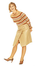 A csónakkivágás és a vállat szabadon hagyó fazonok nagy kedvencek az idei téli divatban. Többféleképpen viselhetők, akár önmagukban – mint a képen látható csíkos pulcsi –, de ráhúzhatók garbóra, kerek nyakú, hosszú ujjú pólóra, sőt, ingre, blúzra is! Csak egy kis fantázia kell, és szuper összeállításokat kreálhatunk. A felsőhöz Anita térdig érő, bézs bőrszoknyát választott, amely akár klasszikusnak is mondható, de az aszimmetrikus megoldás miatt inkább erősíti Hajni amúgy is karakteres megjelenését (Mango, bizsu: Promod, cipő: Horváth Cipő)