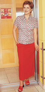 1. A hosszú, enyhén lefelé bővülő, vékony vászonszoknyától magasabbnak és keskenyebb csípőjűnek tűnik viselője. Az apró virágmintás batisztblúz nőies puhaságot sugall (Esprit) |