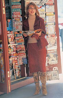 A hosszú szárú csizma, a térdig érő szoknya és a karcsúsított blézer nyújtja az alakot. A konzervatív stílusú, egyszínű hasítottbőr-kosztümhöz jól illik az extravagáns, leopárdmintás, hasítottbőr-csizma