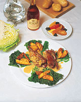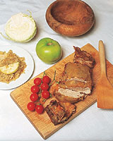 80 dkg meghámozott és feldarabolt almát 2 dl vízben a cukorral, a fahéjjal és a citromlével pépesre párolunk. Ezután kivesszük a fahéjat, az almát durva szitán áttörjük. A fejes káposztát apróra vágjuk, a maradék almát is meghámozzuk, cikkekre szeleteljük, és összepároljuk. A húst sóval, borssal meghintjük, a szegfűszegekkel megtűzdeljük, zsíros részével felfelé tepsibe tesszük, vizet öntünk alá, és 180 fokon, 90 percig sütjük. Ekkor kivesszük a sütőből, a kihűlt almapéppel megkenjük, visszatesszük a sütőbe, és készre sütjük (kb. 30 perc). A káposztás almával körítve tálaljuk.