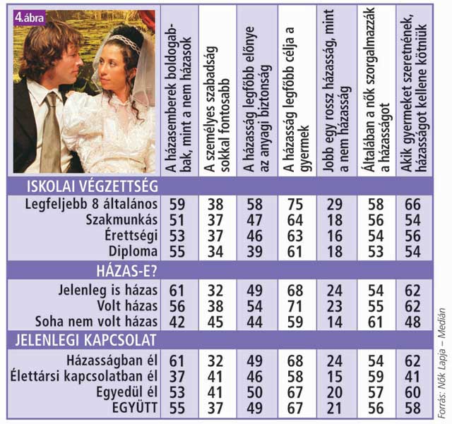 A házassággal kapcsolatos kijelentések közül az, hogy az esküvő tulajdonképpen a külső elvárások miatt köttetik, nem tartozik a legelfogadottabbak közé. Természetesen a szakember ehhez hozzáteszi, hogy a személyes tapasztalatok mellett nagy szerepe van a jelenlegi élethelyzetnek. Mert eljöhet az a pillanat, amikor akarva-akaratlanul úgy érezzük, mégiscsak hat a láthatatlan nyomás.