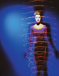 Tegye a kezét a gombokra! szólít fel Dede Éva természetgyógyász, aki a felvételt készíti. A tekintetemből kiolvassa a kérdést (Miért?), mert máris elmagyarázza, hogy ez a mérőeszköz a tenyerem alatt képes bemérni az olyan bioelektromos jellemzőket, mint a bőrellenállás, a nedvesség, a rezgés és a felületi hőmérséklet. A számítógép a jeleket át tudja alakítani színekké hiszen minden színnek megvan a saját rezgéstartománya , és a monitoron megjelenő arckép köré pillanatok alatt odarajzolja a színes aurát. Mire ezt elmondja, megkapom a két képet, amelyeken a fejem és a testem körül kirajzolódik a tojás alakú burok. Furcsa, de izgalmas érzés megpillantani önmagunk rejtett részét. A kíváncsiságon kívül azért lettem kísérleti alany, mert úgy gondoltam, magamat ismerve könnyebb ellenőrizni, igaz-e, amit a számítógép a feldolgozott információk alapján állít rólam. Mint látják, az aurámban az ibolyakék, a levendula és a fehér színek dominálnak.
