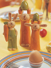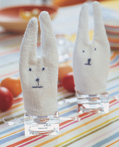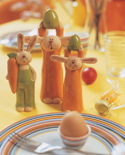 A festett tojások és a vázába állított barkaágak mellett, még számos módon utalhatunk a közelgő ünnepre. Készítsünk puhább, bimbózó ágakból egyszerű koszorút, amelyet az ajtóra is akaszthatunk, de tehetjük asztalközépként az ebédlőasztalra is. A nyuszik, kiscsibék és báránykák a gyerekes családoknál természetes szériatartozékai a tavaszi ünneplésnek, sőt, a dekorációs lehetőségek végtelen tárházát is jelentik. Állíthatunk néhány kerámia tapsifülest az ablakpárkányra, ültethetünk kedves nyúlcsapatot a színes locsolókannákba, de frottírból bolyhos tojásmelegítőket is készíthetünk. Az ajándékrejtő nyuszifészket helyettesíthetjük színesre festett vödröcskékkel, amelyet némi akrilfestékkel vagy alkoholos filccel személyesebbé is varázsolhatunk. A hagyományos virágminták helyett válasszunk vagányabb csíkos textileket