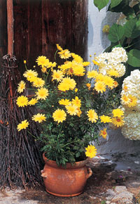 Néhány csüngő növény is kerüljön a virágládákba! Ezek közül is a leginkább szárazságtűrő a szalmagyopár (Helichrysum petiolatum). A legsivárabb helyeket is elviseli. Szürkés, molyos levelű, jelentéktelen virágú, de jó kiegészítője egy színpompás kiültetésnek.