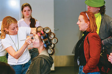 Egy zöldkalapos, élénk fiatalember lép hozzá, nagy vehemenciával magyaráz valamit. Csupa szakkifejezés, egy mukkot sem értek. Ő Márk, a stylist. Aztán talkie-walkie-val a kezében egy világoskék szemű, kivágott ruhás hölgy jön. Eszter, az összekötő. Majd egy idősebb, kopasz úr, nagy tarisznyával az oldalán. Amolyan örök kamasz, örök bohém. Ő John, mint Kati mondja, a világ egyik leghíresebb látványrendezője. Évek óta együtt dolgoznak, most kifejezetten erre a bemutatóra repült ide Londonból. Jegyzetéből útvonalrajzokat mutat, hogy a lányok majd hogyan, merre vonuljanak. Számomra hieroglifák, Kati azonban elmélyülten figyeli, egy-két dolgot megkérdez, aztán kedvesen John vállára teszi a kezét. Rendben. Hátramegyünk a sminkszobába. Több tucat gyönyörű fiatal lány ül mindenfelé. Ki olvas, ki trécsel, ki merengve néz a távolba. Egyikükön dolgozik a sminkes. Az alapozás már kész, most jönnek a kritikus részek, a szem, száj, orr. Lassan mindenki ott áll körülöttük. Több változatot kipróbálnak, melyik is a legjobb, végül megállapodnak kicsit ferde szemöldökben, fehér orrnyeregben, világos szájívben, középen bordó pettyel. Akkor ez lesz az etalon, a többiek is eszerint lesznek kifestve. Katinak gondja van arra, hogy minden manöken kapjon egy-egy jó szót, biztatást. Ők érzékelhetően boldogok ettől.